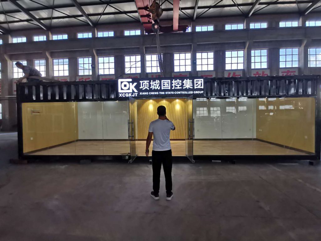 河南項(xiàng)城國(guó)控集團(tuán)銷售中心,定制尺寸為3620*10200*2700mm,總面積37m2,近乎相當(dāng)于1.5個(gè)40GP貨柜箱。外墻為1.2mm厚金屬波紋板,彰顯集裝箱霸氣外形。內(nèi)墻為吸音板+硅酸鈣板,前墻落地玻璃窗,窗明幾凈。本產(chǎn)品采用工廠化加工,整體運(yùn)輸,不僅省去了現(xiàn)場(chǎng)施工環(huán)節(jié),而且方便運(yùn)輸,可循環(huán)使用,大大節(jié)約了造價(jià)成本。
